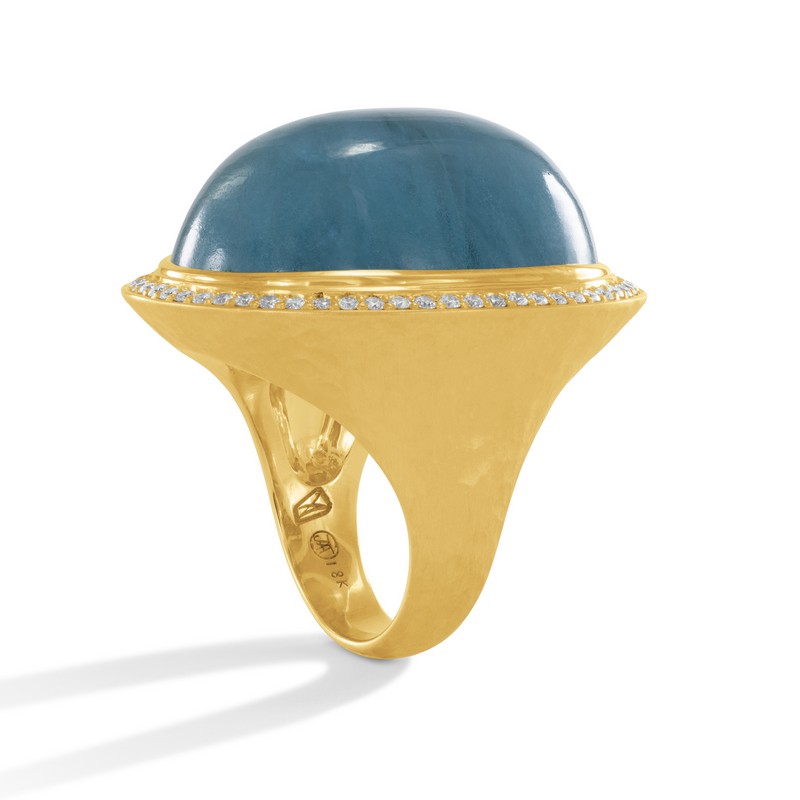 This extraordinary ring showcases the serene beauty of aquamarine in a truly striking scale, featuring an impressive 51.35 carats of aquamarine set in rich 18kt yellow gold. The gemstone’s luminous blue tone evokes the clarity and calm of clear water, creating a look that is both elegant and unforgettable. Surrounding or accenting the aquamarine are 0.63 carats total weight of diamonds, adding a refined brilliance that enhances the stone’s natural radiance without overshadowing its beauty.