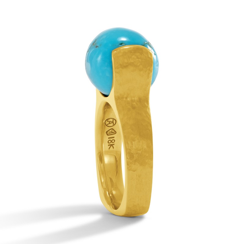 This striking ring showcases a vivid 12-carat turquoise, its natural blue-green hue glowing beautifully against a setting of rich 18kt yellow gold. The smooth cabochon stone is elegantly framed to highlight its color and character, creating a timeless yet bold statement piece.